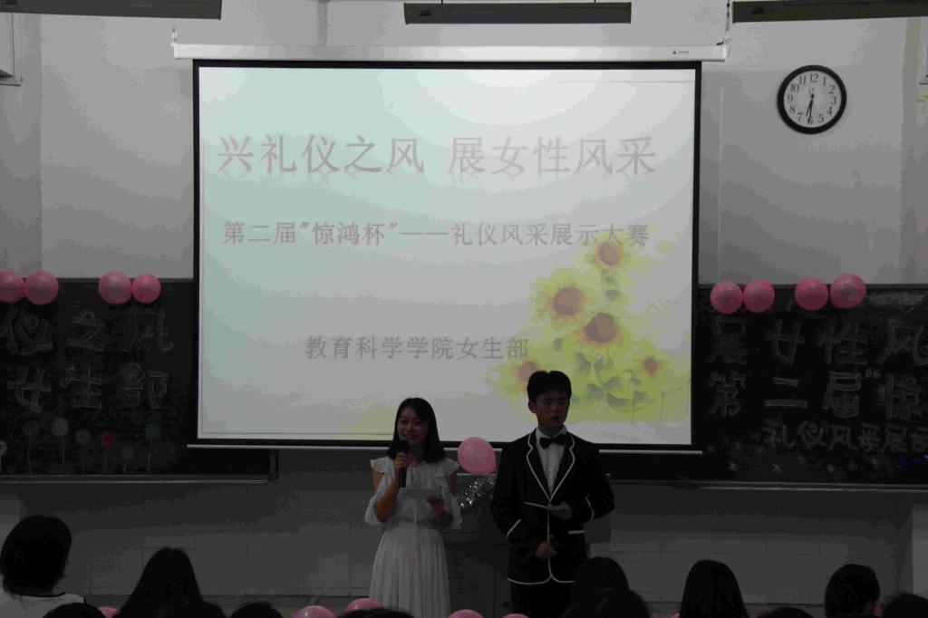 为巩固校园文明建设成果,彰显伟德国际1949学子的文明素养和礼仪风采,5月23日晚,教育科学学院女生部、礼仪队在玉衡楼南栋101教室联合举办了第二届“惊鸿杯”礼仪风采展示大赛——“兴礼仪之风,展礼仪风采”。本次大赛邀请了教科院团总支书记罗娱、女生部指导老师董晓娅、辅导员邓魁担任评委,400余名学生到场观看。