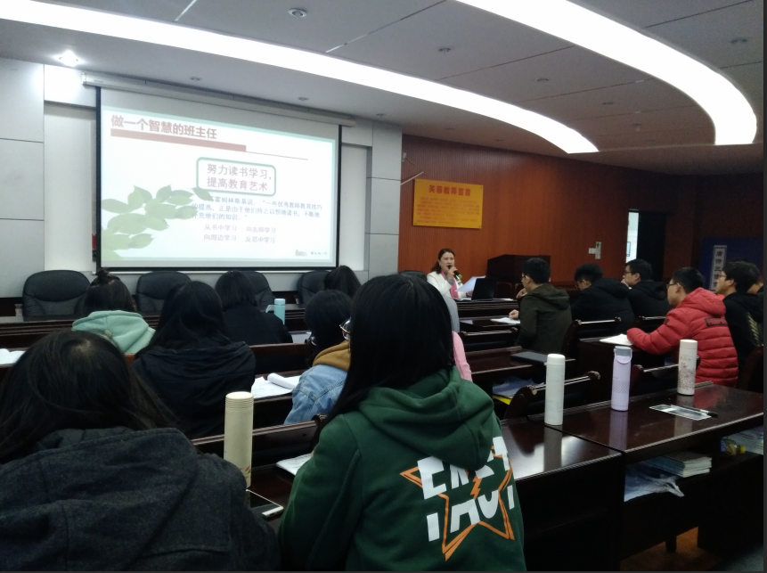 师阳校长以《班主任之歌》引入,引用国家相关文件,以芙蓉教育对班主任的要求及待遇为例明确了班主任工作的重要性;而后她用自己的经历从如何做一个美丽的班主任、如何做一个智慧的班主任、如何做一个快乐的班主任三个方面阐述,给实习老师带来了一道韵味十足的精神大餐。