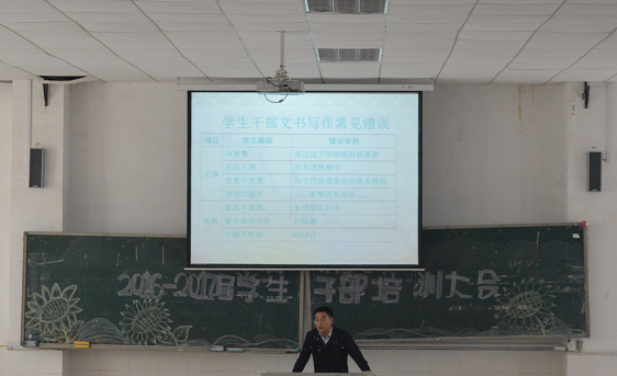 伴随着全体同学高唱团歌,干部培训大会正式拉开序幕。培训中,张俭明书记围绕文书写作这一主题,首先列举了学生干部写作中在标题、称谓、主体及落款等方面出现的常见错误。接下来,张书记以借条、请假条、通知、计划、方案、总结、新闻稿这七种常见事务文书为例,给学生干部们详细讲解了文种内容形式要求,强调了文体写作注意事项,并通过生动的实例评析来加深同学们的理解。最后,张俭明书记对此次干部培训大会进行了总结,希望学生干部们能增强团队意识,提高公务写作水平,不断提升自己的能力和素养,通过更有效的工作更好地为同学们服务。大会在同学们雷鸣般的掌声中圆满落幕。
