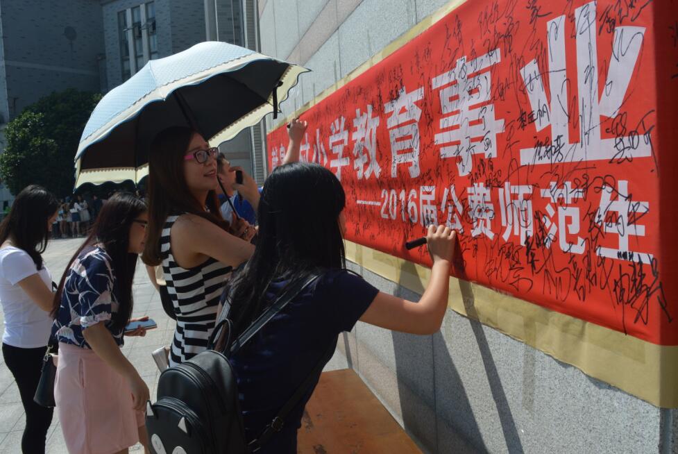 活动开始,各毕业班学生身着学士服,精神抖擞,满怀感恩地与学院领导和老师合影留念,并在“献身农村小学教育事业”的横幅上郑重签名,表达他们对教育的热爱和对自己未来的承诺。教育科学学院2016届毕业生共744名,他们通过几年的刻苦学习,已经达到了一名合格小学教师的标准,他们将是我省基础教育的又一批生力军。