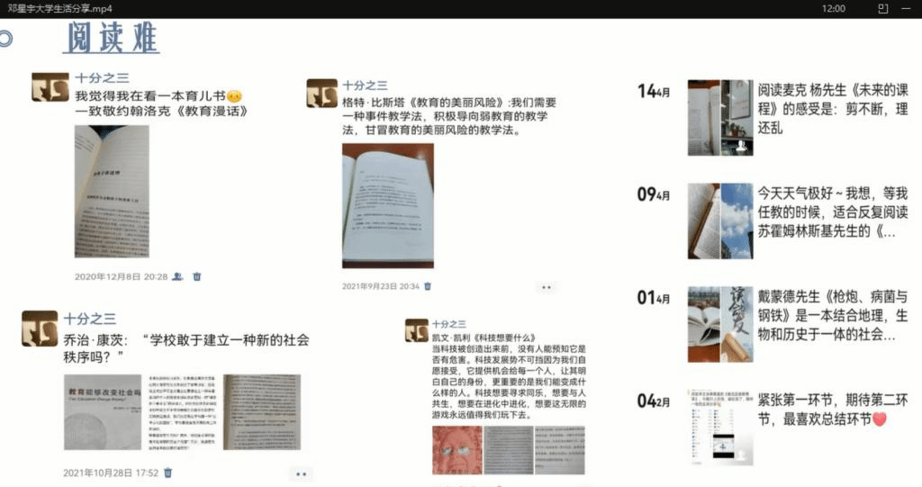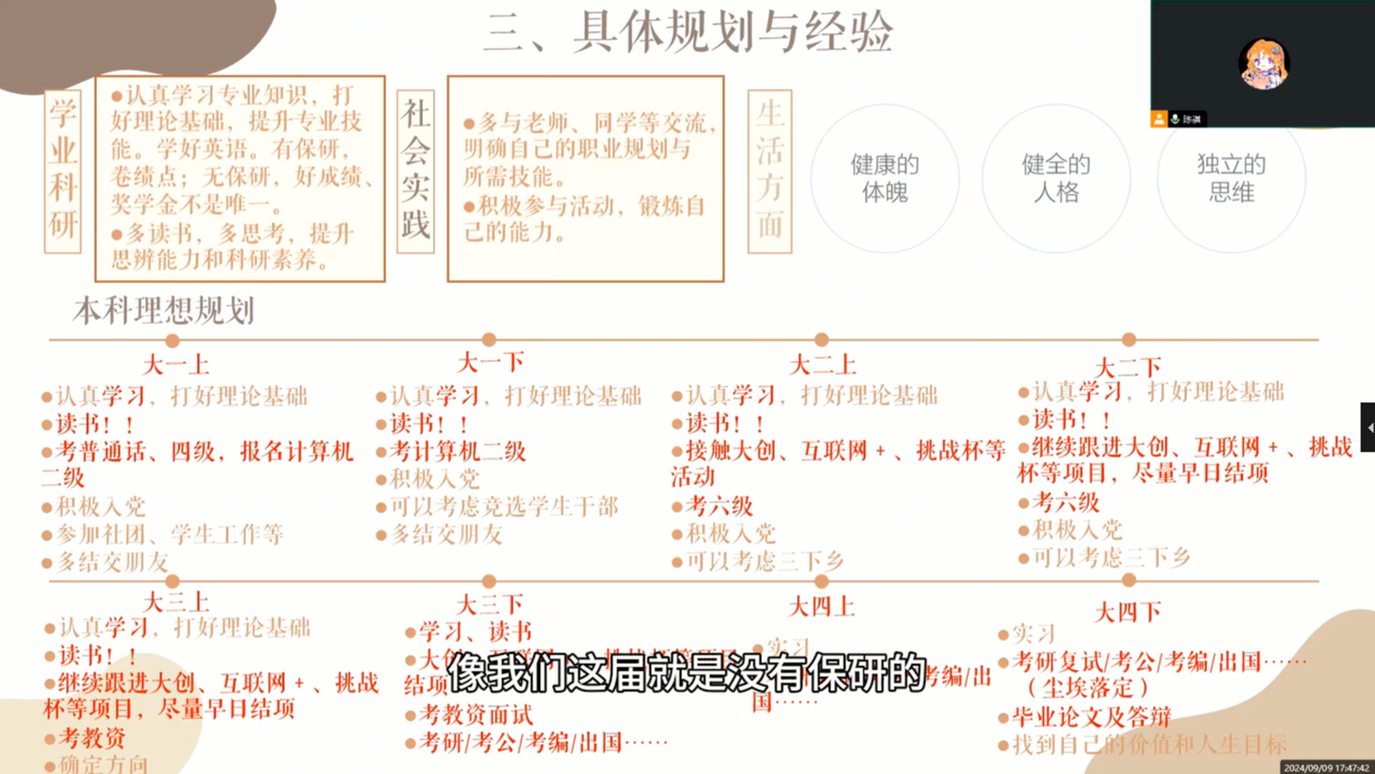 邓星宇、陈祺、成铎文、刘彦瑶分别从核心竞争力的提升、资源的有效利用等方面进行了深入的分享与交流。在学术研究方面,邓星宇以自己最开始接触学术专著阅读讲起,与同学们产生共鸣,强调专业阅读和自学对提升个人综合能力的重要性;陈祺以自己的大学规划开始讲起,阐述了自己在大学四年期间的学习、经历和提升,分享高效学习方法和时间管理技巧,鼓励新生们充分利用学术资源,拓宽知识面,为自己的未来发展奠定坚实基础。他们还充分结合自身现状,现身说法,教同学们如何应对压力与焦虑,鼓励同学们正视心理健康问题,推荐学习软件和应用程序,鼓励同学们积极寻求帮助和资源。
