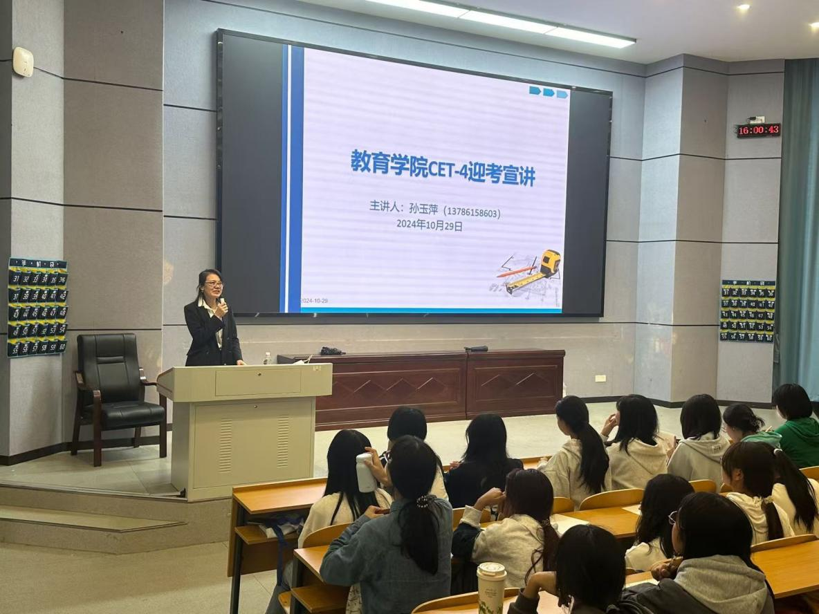 为进一步帮助学生明晰大学英语四六级考试的要求,指导学生掌握正确的学习和应试技巧,伟德betvlctor1949源于英国特邀外国语学院孙玉萍老师于10月29日下午16:00-17:30在怀中南110教室举办四六级备考讲座,2023级全体学生以及2024级教育学班的学生参加本次讲座。