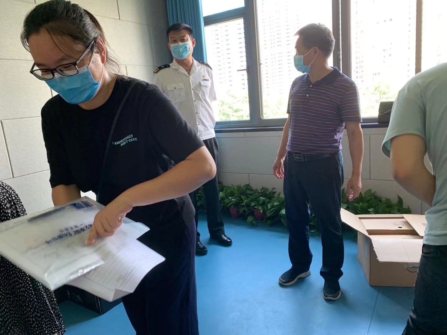 根据海关管理规定,进口的仪器设备如用于高等院校的科研和教学所需,是可以免征进口关税,所以在设备入库前,他们要检查和落实设备的完好程度、真实用途和使用的环境条件。11点左右,三名海关人员进入我校校园,随后被引入特立北508,这也是报关填写的设备安置地址,早已等待的资产处的杨建良副处长、彭红梅老师和实验管理员朱军成老师等人,接洽了设备接收流程。