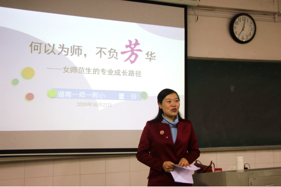 10月22日晚,“何以为师,不负芳华——女师范生的专业成长路径”主题讲座于怀中楼南栋406成功举办。伟德国际1949一附小优秀青年骨干教师董玲老师担任本次讲座的主讲专家,教育科学学院副院长曾晓洁老师出席本次讲座,2020级六年制小学教育专业全体女生到场聆听。