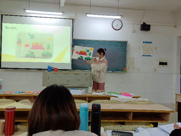 活动开始,12名选手现场抽签决定上场顺序。每位同学依次结合PPT进行6分钟的自制教具展示,讲解。同学们以饱满的热情、沉着的心态展示了自制教具,还说明了自己的设计理念,设计意图,服务的内容和教具特色。选手们的自制教具制作精美,构思巧妙,应用范围广并且十分具有创新性和实用性。同学们的展示如同“八仙过海,各显神通”,荣蝶同学的作品《数学游乐园》,巧妙地将平移,旋转,轴对称等多种数学现象融入生活并直观展示出来;周欣同学的作品《国之重器,动起来》还将爱国爱党的课堂思政融入到数学学习中;易婕同学的《乘法口诀“棒棒糖”》巧妙地运用了旋转,将乘法口诀变得生动有趣;滕青林同学的作品《各就各位》运用三维教具和小故事将课堂变得生动有趣……