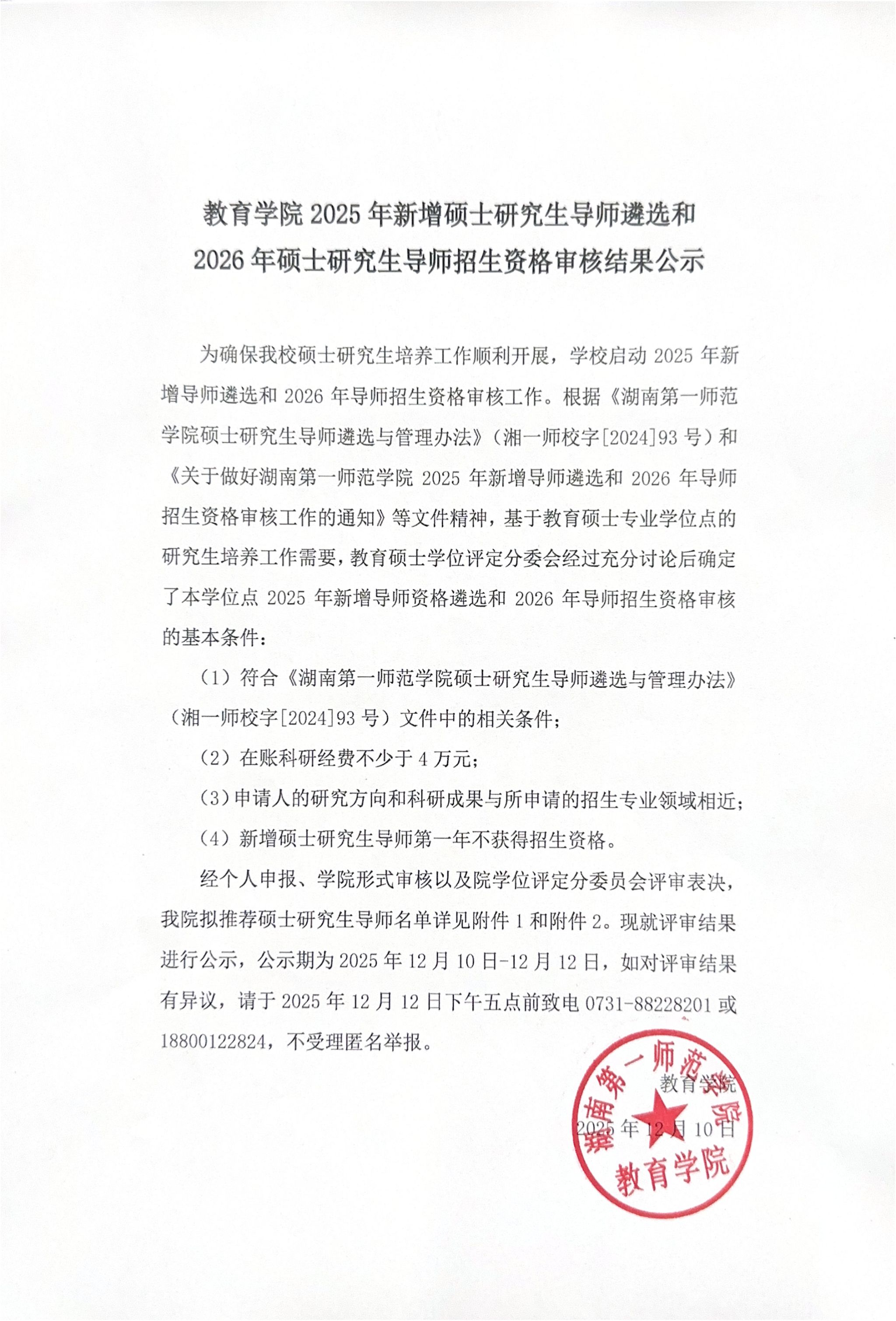 经个人申报、学院形式审核以及院学位评定分委员会评审表决,我院拟推荐硕士研究生导师名单详见附件1和附件2。现就评审结果进行公示,公示期为2025年12月10日-12月12日,如对评审结果有异议,请于2025年12月12日下午五点前致电0731-88228201或18800122824,不受理匿名举报。