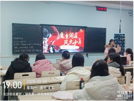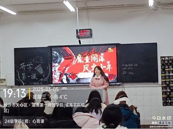 本次课程以“哪吒归来,收收心,重塑莲身”为主题,巧妙借用哪吒“逆天改命”的故事,暗喻大学生活中可能面临的挑战与蜕变。课堂伊始,朋辈心理辅导员廖小芳以“打碎偏门,你是谁,你说了算”为切入点,结合新学期同学们常见的学业焦虑、生涯迷茫案例,鼓励同学们正视自我价值,摆脱外界标签束缚。随后在“英雄之音:正年轻,全力以赴”环节中,通过优秀学长学姐分享成长经历,传递“立目标,我能实现”的信念,瞬间点燃了现场学子的热情。