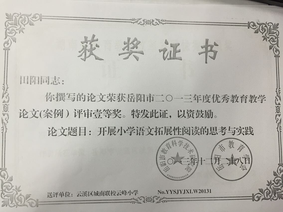2013年12月论文“开展小学语文拓展性阅读的思考与实践”获得岳阳市2013年度教育教学论文评审一等奖