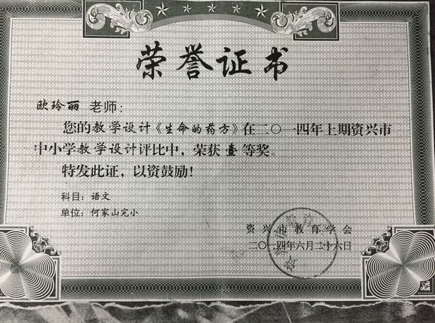 2014年教学设计《生命的药方》在资兴市中小学教学设计评比中荣获一等奖