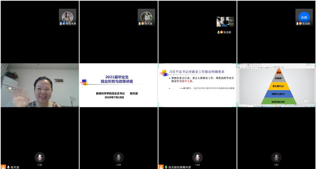 就业是民生之本,党和政府高度重视就业工作。习近平总书记多次强调就业工作的重要性,尤其是高校毕业生的就业工作,总书记在今年的中央政治局会议指出,“要抓好重点行业、重点人群就业工作,要把高校毕业生就业作为重中之重”。对此,教育科学学院党政领导高度重视就业工作,提前规划部署,开展就业指导工作,以就业指导课为契机,院党总支书记陈天涯、党总支副书记张志新、学工办主任刘军等学院领导老师于7月19日至20日为2021届的毕业生们开展就业指导课程讲座。