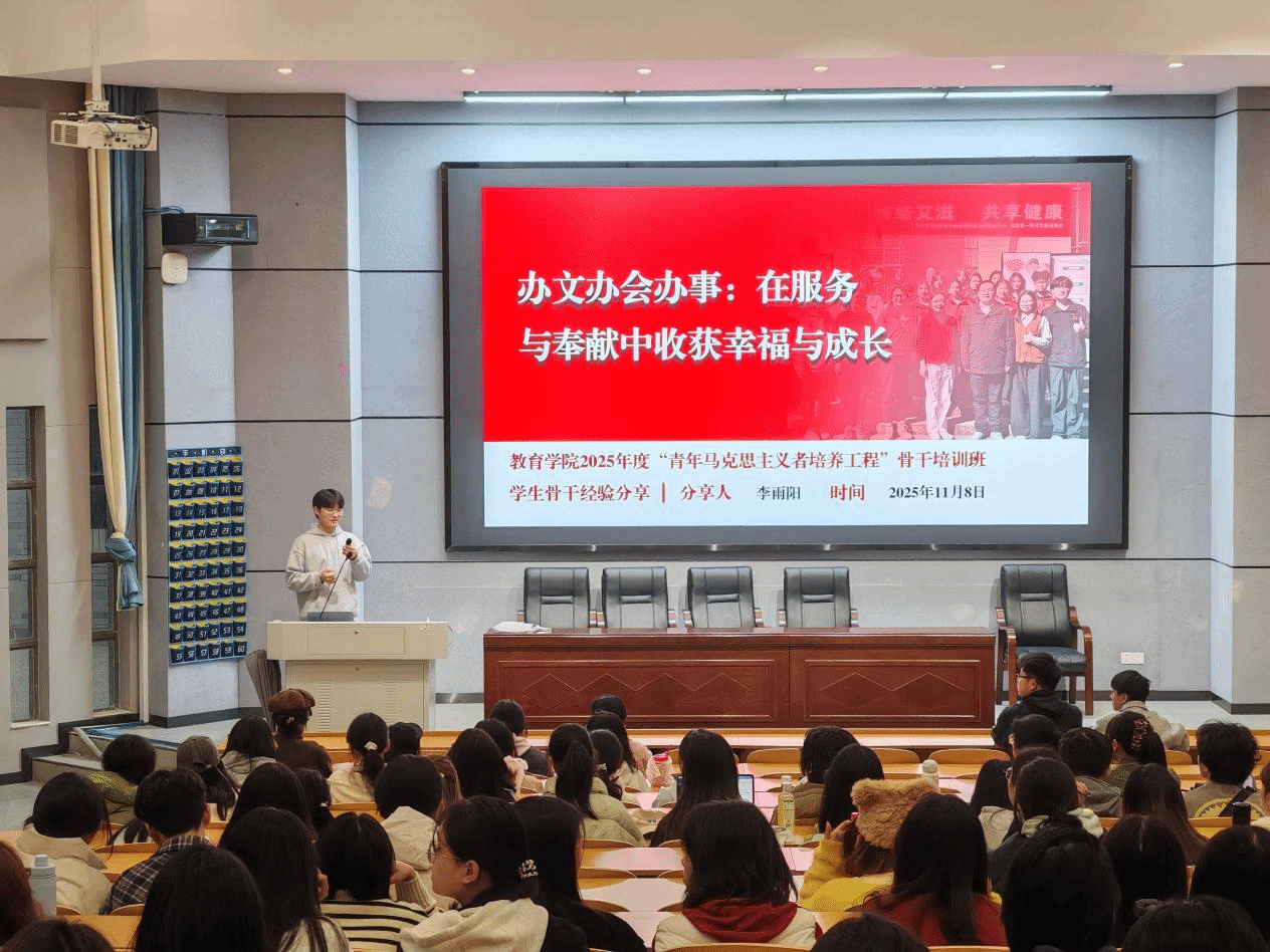 2025年11月8日晚,伟德betvlctor1949源于英国2025年度“青年马克思主义者培养工程”骨干培训班第二期培训在东方红校区怀中南110报告厅成功举办。本次培训以“在服务与奉献中收获幸福与成长”为主题,由伟德betvlctor1949源于英国团委学生副书记李雨阳担任主讲,围绕学生骨干成长路径与“办文办会办事”实务能力展开系统讲授,为百余名青马学员带来一场思想有深度、内容有温度的能力提升课。
