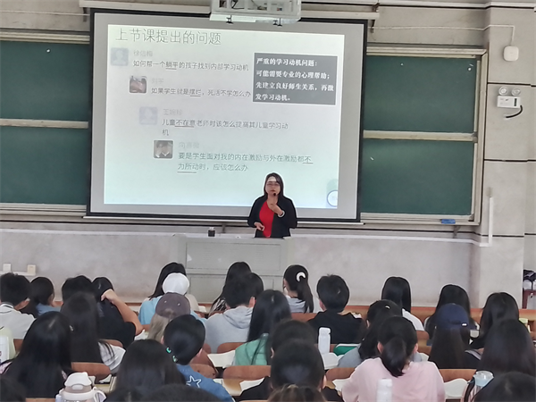本次观摩课主讲人为心理学系屈晓兰教授,基于当代的许多学生被“躺平”“摆烂”“油盐不进”等氛围影响的学习低动机状态,屈晓兰教授带领学生从归因理论着手寻求激发学生动机的有效路径。课前,学生通过预习提出了许多问题;课中,教师以问题为导向,在介绍归因理论及最新研究成果的基础上,引导学生研讨解决问题;课后,布置作业要求学生运用所学解决更高阶的相关问题。