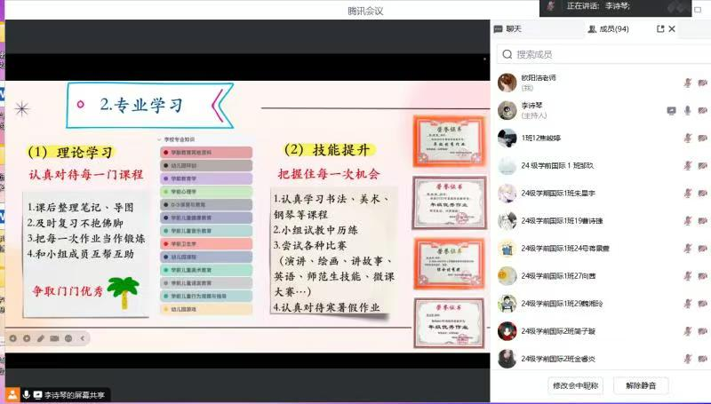 10月21日上午,南京师范大学学前教育专业研究生新生李诗琴通过视频会议,给24级学前国际1、2班的99位同学分享了她宝贵的大学期间求学经验。分享活动由24级学前国际2班的班主任欧阳洁老师主持。