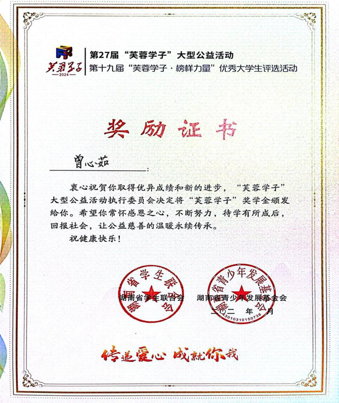 我院22学前1班曾心茹同学荣获自强不息奖,是全校十名获奖者之一。