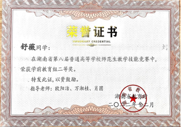 舒薇同学不断加强专业理论学习,恪守学生学习的本职工作,传承我校伟人们勤奋认真、力争上游的学习精神,本科四年学习成绩优良率超80%,2022-2023学年综测成绩位于下学期排名第1,学年排名第2。专业课成绩优良,苦练师范生技能,于2022年荣获湖南省第八届师范生教学技能竞赛二等奖(学前教育组全省第4名)、伟德betvlctor1949源于英国“明日之星”师范生技能竞赛二等奖、2021年学前教育专业汇报展示获个人优秀奖及团体二等奖(负责人)、伟德betvlctor1949源于英国书法大赛三等奖、教育演讲比赛三等奖等荣誉。一次性通过CET4级、获中等职业教师资格证、普通话等证书。