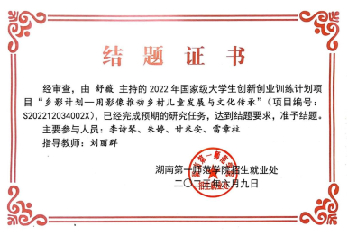 2022年7月,舒薇同学主持国家级大学生创新创业训练项目《乡影计划—用影像推动乡村儿童发展与文化传承》项目于2023年7月顺利结项。2022年6月,主负责第十届“挑战杯”项目《大山里的眼睛—儿童摄影助力乡村振兴新模式的探索者》 获省级银奖。2022年10月,主负责《大山里的眼睛—儿童摄影助力乡村振兴新模式的探索者》获第十届“挑战杯”校级一等奖。2023年7月,以第一负责人获中国国际互联网十大学生创新创业大赛项目《小问号计划—致力于赋能城乡课后教育服务的公益先行者》校级二等奖,2022-2023年院级五四表彰获“学术科研先进个人”。