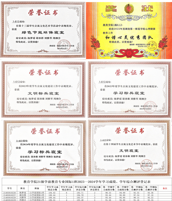 在寝室建设的道路上,她们始终秉持全面发展理念,硕果累累。作为“绿色环保寝室”,彰显着她们践行低碳生活的决心,从节能降耗到废物利用,让环保意识扎根日常;获“和谐心灵优秀团队”,因为她们以温暖与理解为纽带,构建起心灵互助港湾,共同守护心理健康;凭借全寝学业及综测均排名班级前十的优异的学业成绩,她们多次获得“学习标兵寝室”,形成浓厚的共同学习、一齐进步的良好氛围;而“文明寝室”的荣誉,则是对她们和谐相处、规范自律的最好肯定。这些荣誉见证着她们在思想、生活、学习等多方面的卓越追求与不懈努力。